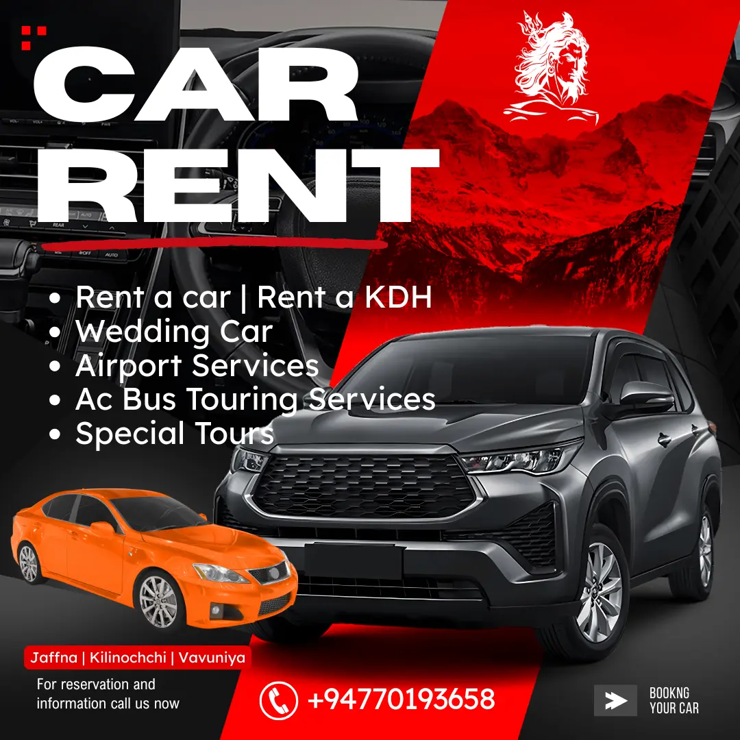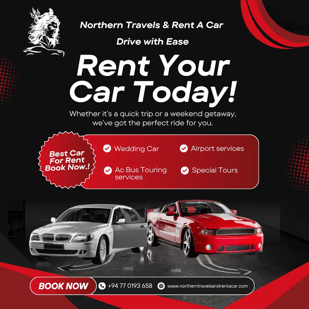 Explore Sri Lanka with Northern Travels and Rent a Car, your reliable travel partner offering premium car rental services in Jaffna, Kilinochchi, and Vavuniya. We provide a complete range of transport solutions including Rent a Car Sri Lanka, Airport Pickup and Drop Sri Lanka, and Wedding Car Hire Sri Lanka, ensuring comfort and convenience for every journey.