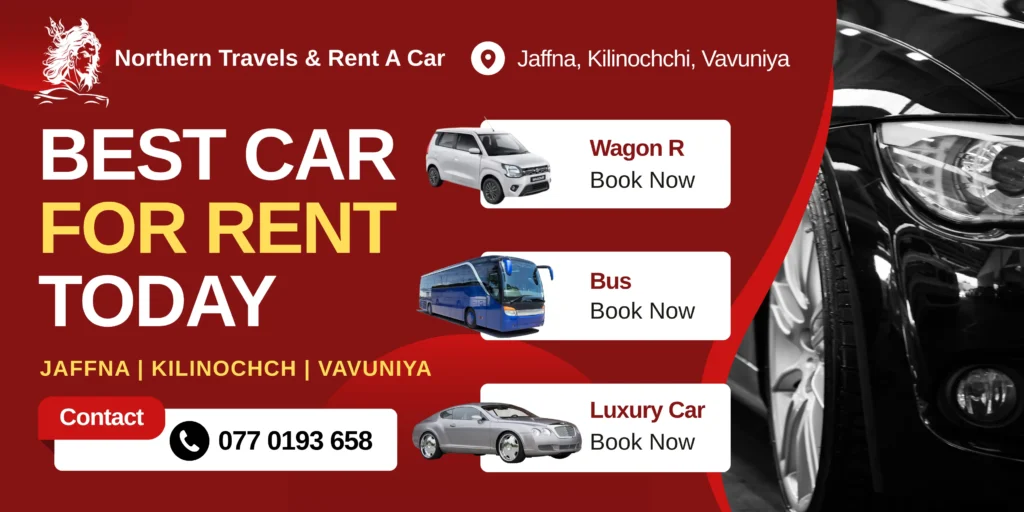 Explore Sri Lanka with Northern Travels and Rent a Car, your reliable travel partner offering premium car rental services in Jaffna, Kilinochchi, and Vavuniya. We provide a complete range of transport solutions including Rent a Car Sri Lanka, Airport Pickup and Drop Sri Lanka, and Wedding Car Hire Sri Lanka, ensuring comfort and convenience for every journey.